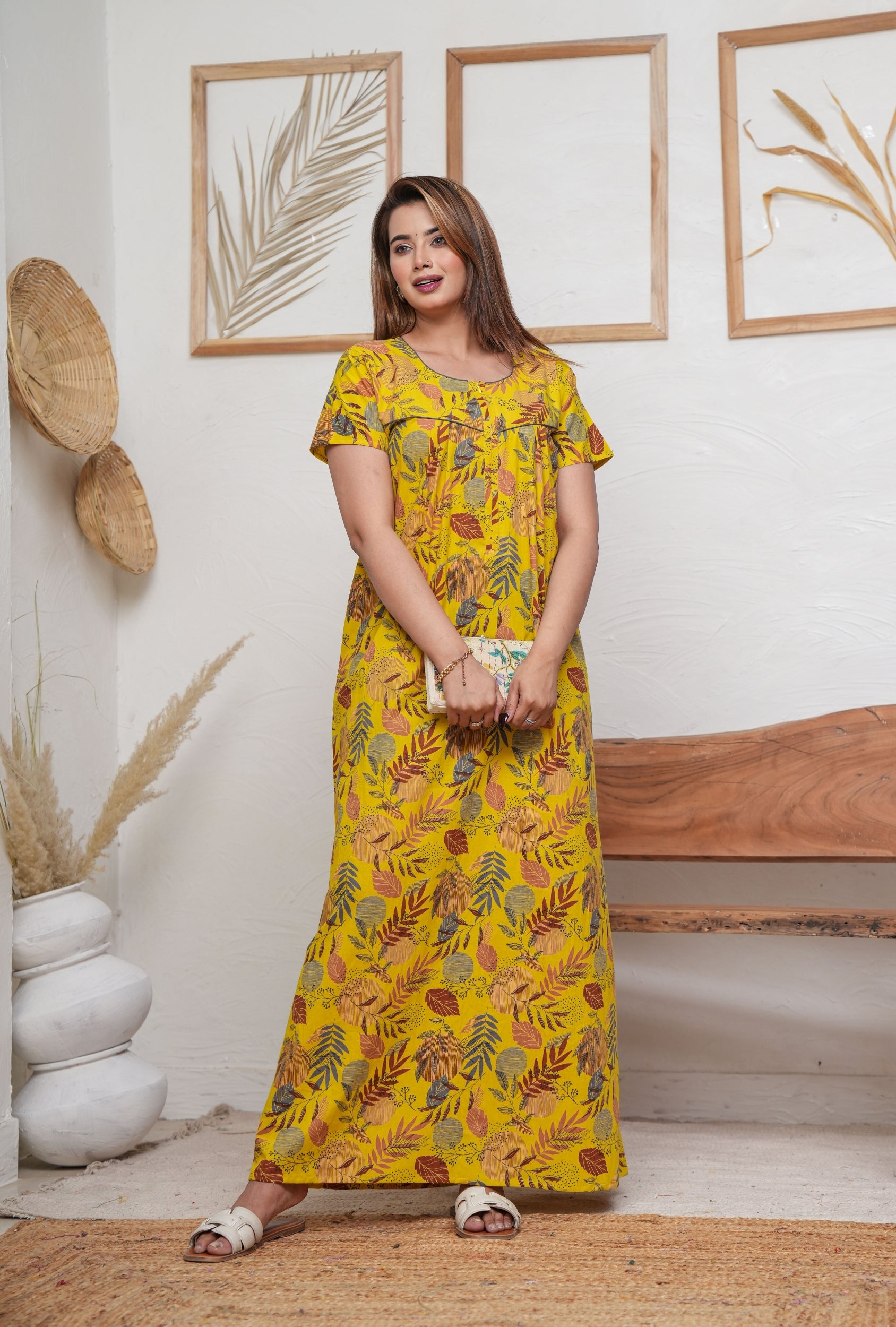 Shop the Lining Leaves Yellow Cotton Printed Nightwear Gowns – crafted from 100% cotton for ultimate comfort. Relaxed fit, stylish design, and perfect for peaceful nights.